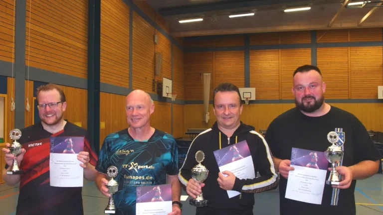 Foto (Veranstalter Langweid) – von links nach rechts: Andreas Martin (TV Kaufbeuren), Axel Schmidt (TSV Oberstdorf), Jörg Liebert (TTC Langweid), Husein Ahmic (Polizei SV Königsbrunn) Ende Oktober fand in Langweid die Tischtennis-Bezirkseinzelmeisterschaft der Herren E-Klasse statt. Andreas Martin, Spieler des TV Kaufbeuren, konnte hier sowohl im Einzel, als auch im Doppel den 3. Platz erreichen …